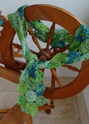 This is the 11th in my personal challenge for 2014 of designing a crochet scarf a month! For November I wanted to design a motif scarf, something that made up quickly and in a thicker yarn so it would be warmer. When looking through my stash I found this beautiful silk yarn from Willow Knits, it is a heavy dk/worsted weight and the colours glow. I had 5 colours of green and decided to stock up on some more especially for the design. The simplicity of the motif sets off the colours well. It is a hexagon but looks a little like a circle and it makes me think of circles swirling in a green sea. I used 5 colours of yarn, making 61 motifs and alternating them in a regular pattern as shown on page 4. I used about 180g/400m of yarn. I recommend a minimum of 3 colours and try to avoid too many variegated yarns. The motif would also be great in a blanket. As usual, the instructions are provided in English and US crochet terms, and charted