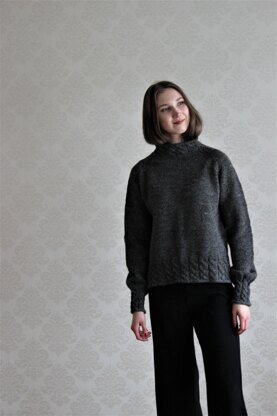 Sylissä Sweater is knitted from the top down in one piece. The boxy raglan sweater has slits and cables at the hem and cables in the cuffs and collar. The cuffs are knitted with smaller needles.