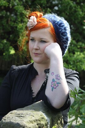 The hat uses two different weights of yarn - approximately 150 metres of a DK weight yarn and approximately 175 metres of a 2ply/lace weight yarn. The lace weight is held double for the band. Construction is bottom-up from a tubular cast-on (optional). After knitting the band the underhat is first knitted in the DK yarn and then the overhat is knitted in the laceweight on picked up stitches from the band. The underhat and overlace are married together through the blocking process.