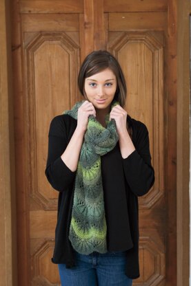 This scarf was inspired by a vintage counterpane (bedspread) pattern, and is long enough to keep you just as warm. Knit in two pieces, the scarf is joined at the center to create symmetrical, scalloped edges on each end. The self-striping yarn does the color work for you.
