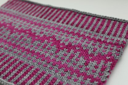 This cowl is worked entirely in the round, using two colors throughout. The colorwork pattern is charted only. Two skeins of the recommend yarn should be enough to knit two cowls, especially if the colors are reversed. (Note that the recommended yarn comes in both 50 g and 100 g skein. 50 g skeins were used for the sample.)