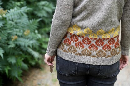 A relaxed sweater with autumn leaves on the hem.
