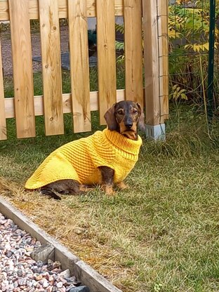 Tähti sweater is designed for a dog with a deep chest, such as dachshund. This thick & warm sweater is seamlessly knit from down to top, both flat and in the round with circular needles. Stitches used in the pattern are knit stitch, purl stitch, rib stitch, and daisy stitch. Instructions on how to knit the daisy stitch are included in the pattern.