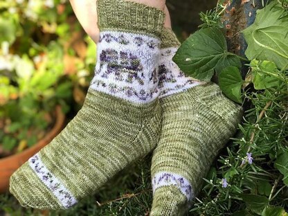 These socks are cuff down, stockingette stitch with a band of stranded knitting across the leg and also on the toe. The heel flap construction allows a good fit for a medium- larger women's sized foot.