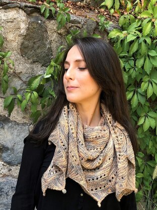 The shawl is worked top down, in a combination of garter stitch and eyelets in a crescent shape, finished with an edge worked sideways.