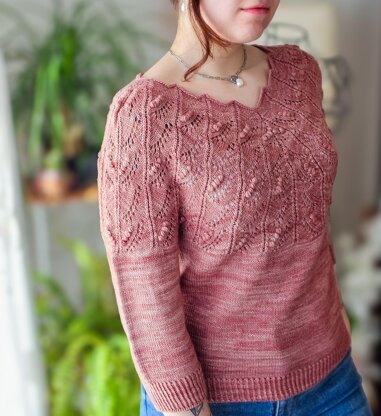 The delicate lace yoke creates a flattering V-neck, drawing the eye to its thoughtful details, while the calm, smooth stockinette of the body and 3/4 sleeves lets the lace truly shine.