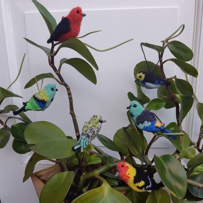 There are six birds included in this pattern: the paradise tanager, green-headed tanager, Western tanager, scarlet tanager, seven-colored tanager and the speckled tanager. Each bird is a small, easy and fun project, that can be finished in an evening or so and a great way to use up any scraps you have lying around.