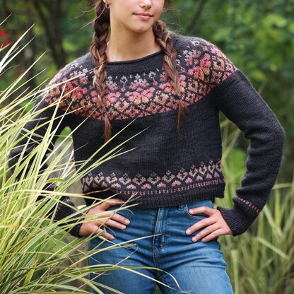 Beginning at the neckline, Tapestry is worked seamlesly in the round from the top down. Just after the rolled collar, short rows are added to create a higher back neck and a stranded colorwork yoke is worked. Next, sleeve stitches are placed on hold and the body is worked, in the round. The cropped length body includes additional stranded colorwork just prior to working the ribbed hem. Sleeve stitches are then picked up and worked in the round. The sleeves also include stranded colorwork before finishing with a ribbed cuff.