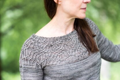 Notes: This sweater has a circular yoke and is constructed from the top down in one piece. Short-row back neck shaping and raglan shaping are worked after the yoke pattern is complete. The pullover is modeled with slight negative ease, but if you desire a looser fit, make a size that measures slightly larger than your bust. There is no body shaping past the armholes but waist shaping may be easily added. The sleeves and body can easily be lengthened by adding more rounds.
