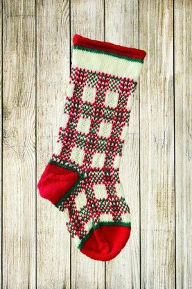 The Tartan Plaid Christmas Stocking is worked in the round from the top down. The stocking features a 3-color plaid motif and an I-cord trim at the top. The stocking can be personalized by adding an optional name band.