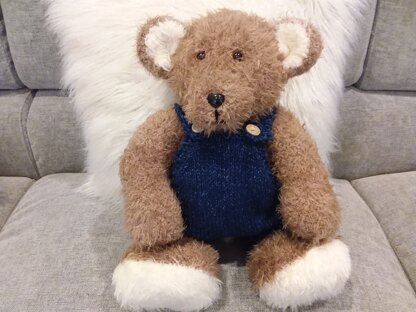 Tayberry Bear stands at 16 inches or 40cms. He’s a stocky little bear with short legs and long body, very big feet; I think he’s going to be a big bear!! His dungarees are designed to give him a bit more growing room anyway and have a roll up hem to allow for this.  He has shaped arms and big paws, just right for picking those berries.