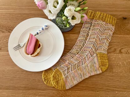 The design features some lace and garter ridges that undulate through the sock, just like the flaky layers of pastry in a mille-fueille.