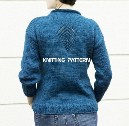 The teal sweater is designed with a flattering fitted shape and 7/8-length sleeves. This classic knit features a subtle diamond motif on the back for added interest. The sweater is worked flat, bottom-up, beginning with the back and front panels, and the pieces are seamed together to finish. Its simple construction makes it easy to knit in almost any yarn—just be sure to match the gauge by working a swatch. The pattern is also highly adaptable: you can customise the fit in both width and length, and extend the body and sleeves to your preferred measurements.