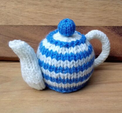 An easy-to-follow knitting pattern, using straight needles and small amounts of DK yarn. Toy stuffing is needed for spout and teapot knob.