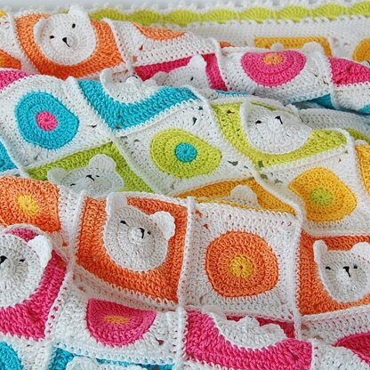 This 21 page crochet pattern includes:- Step by step instruction on how to make teddy bear square, circle square and border