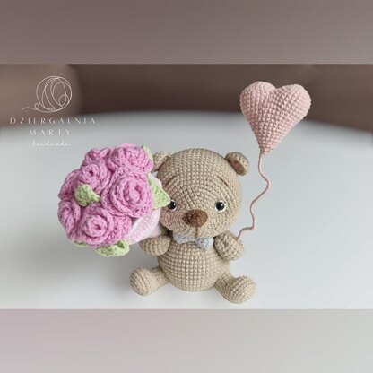Pattern for carrying the valentine’s teddy bear with bouquet out with crochet method. Pattern in the form of PDF file.