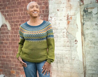 Teranika is a top-down seamless yoke sweater with a deep colorwork chart that uses a series of complementary and contiguous colors worked in a lively contemporary Fair Isle motif. The ribbed neckline is followed by short rows at the back of the neck to create a comfortable fit. This is followed by the stranded knitting that is worked in multiple colors, although there are never more than two colors per round. The chart continues past the sleeve and body divide. The sleeves are knit in stockinette stitch, and the cuffs and body are finished off in ribbing. This pattern includes a symbol chart that can be colored in with your personal choice of colors, as well as a chart for a two-color alternative.