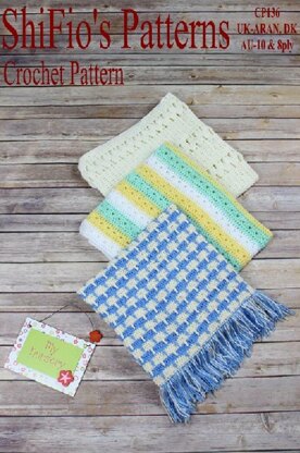 USA Materials:(1) Trellis blanket, 10.5ozs(774yds) bulky yarn and G hook matches pattern 2 Trellis jacket(2) Green, lemon and, white blanket: 2.75ozs(229yds) of each color light worsted (3) and F hook (3) Drop stitch blanket, 5.5ozs(459yds) of each color light worsted (3) and E hook