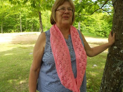 Finished measurements: unblocked are—52” long x 6” wide. Yarn: 273 yards sport weight. Sample was made using 1 ball Knitpicks Brava Sport; in color—Cotton Candy; 100% Premium Acrylic; 273 yards/100 gram.