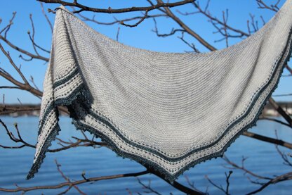 Tes is a little garter stitch crescent shawl in two colors with a scalloped edge and picots. Designed specifically to be worn bandanna-style around your neck, it also makes a light shoulder covering for warmer weather.