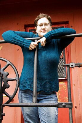 From the pattern description: Are you ready for fall yet? If not, this sweater will get you there! Extra long sleeves with deep cabled ribbing and a wide, snuggly shawl collar will keep your wrists and neck warm on even the nippiest of days. Lace/cable motifs at the hem help to balance out the neckline and minimize the waist, flattering all shapes and sizes. Knit from the bottom up entirely in one piece, the seamless set-in shoulders and collar construction are fun and interesting for even the most experienced of sweater knitters.
