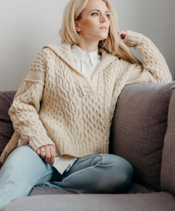 Yarn used in sample (size 2) is 9 skeins of Studio Donegal Soft Donegal (100% Merino wool; 190 m 208 yds / 100 g) in colourway Cream (5507).