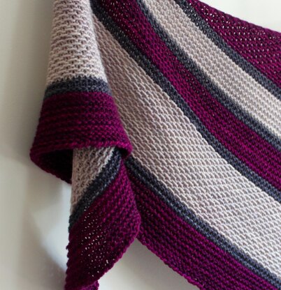 This asymmetrical three colour shawl is worked from one corner point to the opposite edge. Simple increase and decrease stitches are used while the coloured stripes are worked. A slipped stitch pattern is used for some stripes and garter stitch for others. Worked in this gorgeous merino and baby camel blend, this shawl is soft, squishy, and colourful. This pattern is designed for three colours of Plucky Knitter Cozy, but any DK or Sport weight yarn may be used. 238 m (260 yds) of the MC was used, approximately 210 m (230 yds) of CC2, and approximately 105 m (115 yds) of CC3. Skills required: increasing, decreasing, changing colours, blocking. Stitches used: k, p, sl1, kfb, k2tog.