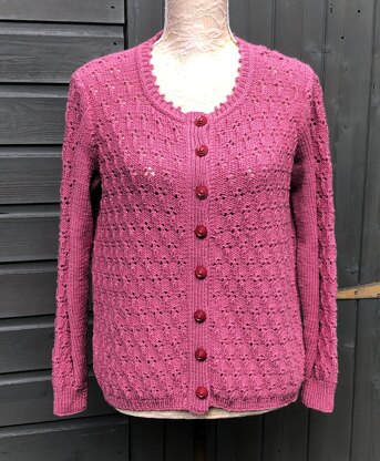 A really pretty, all-season lacy cardigan suitable for many occasions. The back and fronts are worked in an elegant eyelet lace effect pattern, while the set-in sleeves are knitted in stocking stitch with a central panel of eyelet lace patterning for added detail. All borders are finished in neat single rib. The neckband features a raised purl ridge at the base of the neckline and is completed with a charming picot edge. Worked bottom up and with full written instructions.
