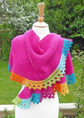 The Shawl can be knitted in DK weight or 4ply/Fingering weight yarn. Two sizes are offered in each weight. The main body of the shawl should be knitted in a solid or semi-solid colour to best show off the textured stitches in the pattern. The edging can be knitted in the same colour or a contrast/multi-colour to give an accent as in the images.