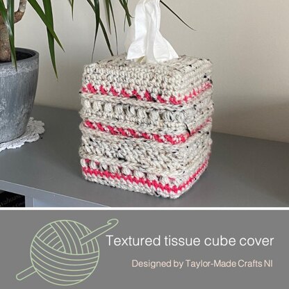 This tissue cube box cover is worked in joined rounds with two colors. The cover is textured with various crochet stitch types, so it’s great for someone that wants to learn or practice different techniques in one project. This little cover is a super handy way to jazz up tissue cubes around the house – just simply place it over the tissue cube and pull tissue through the hole at the top, then replace the cube when empty.