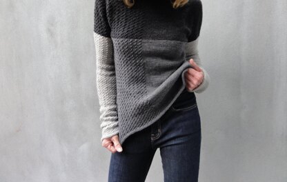 TextureTide is a top down raglan sweater. It has a simple and fun-to-knit textured pattern on one side of the body and one sleeve. It can be knitted with 3 colours (great for using up leftover favourite yarns) or in a single colour.