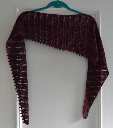 This shawl has a scalene triangle shape and features an asymmetrical border design. It works equally well as a scarf or shawl. The use of several different simple stitch patterns make this design perfect for a hand dyed yarn because the stitch patterns are subtle enough to let the yarn shine.