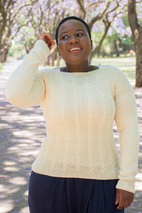 This pullover is named Thandeka, a Zulu name meaning, “Loved One/Loveable”. There is so much to love about this pullover. It is a very easy construction; knit from the bottom up, in the round. There is no sleeve shaping (drop shoulder sleeves) and no neck shaping (boat neck).