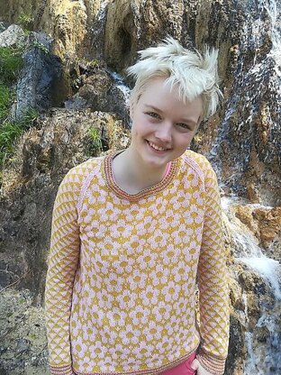 The colors of the seventies were warm and muted. This colorful design invoke the spirit of the 1960s and 1970s. A stranded design, these vintage inspired flowers and simple triangles make for a fun, colorful sweater designed for everyday wear. It has raglan sleeves, colorful bands and edgings, and a simple straight shape. It is knit bottom-up.