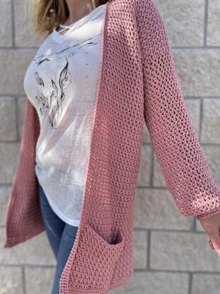 This is a crochet pattern for the Alivia Cardigan, an easy and versatile Cardigan that will pair perfectly with all your favorite outfits. It is worked in 3 separate panels using simple single crochet stitches and chain stitches, creating a beautiful and modern texture.