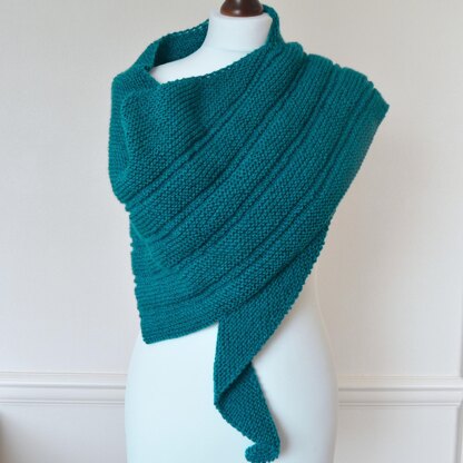 Design: A wide asymmetrical triangular scarf/shawl knitted mainly in garter stitch with side shaping and a garter/stocking stitch pattern on the wider section.