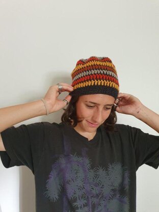 I designed this beanie during Covid 19 lockdown in Australia in 2020 . I was reminiscing about the chooks of my childhood as we had chooks and there was a large chicken farm producing eggs next door . I spent a lot of my childhood there .