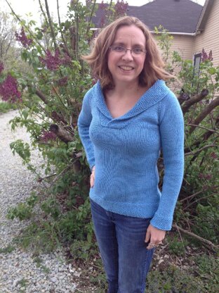 Pattern has 5 sizes for bust sizes at 28", 32", 36", 40" and 44". Worked as a top-down raglan, shawl collar is knitted on later in seed stitch with short row shaping.