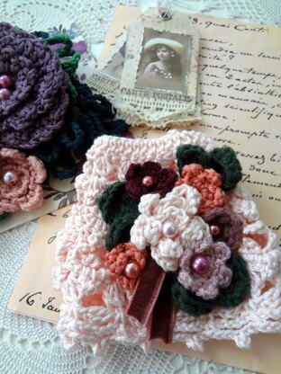 sewing needle for sewing the flowers, leaves and accents on, tapestry needle for weaving ends of cuff. Optional: glass / pearl beads, sequins, ribbon / lace Stitches: chain (ch), chain space (ch-space), skip (sk), slip stitch (sl st), single crochet (sc), half double crochet (hdc), double crochet (dc), 3dc cluster, treble (tr) picot. American terminology used.
