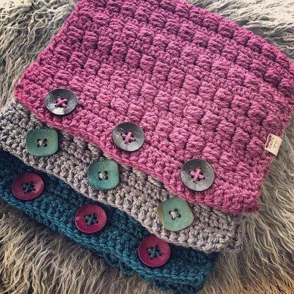 Materials • Yarn: Loops & Thread Charisma (278 yds) • Hook: K/6.50 mm • Notions: 3 buttons of choice, Scissors, Blunt needle for sewing