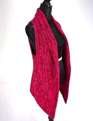 This vest is written in a wide range of sizes. The pattern includes extra fitting information for fuller figures. It has a forgiving fit and will flatter many body shapes. The classic vest back gives the garment structure, while the front is constructed as a simple straight piece of knitting with angled edges creating points at the front. The front shape creates a strong, slimming vertical line on the body. The edges fold back into a shawl collar exposing a nubby fabric. The stitch pattern lays flat and creates a gentle transition at each colour change, subtly blending the shades. The two row stitch pattern has been written in an eight row format for the front. This is to aid the knitter in aligning the stitch pattern while working the increases.