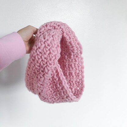 The pattern’s twist produces a folded fabric, making it an extra cosy neck warmer.