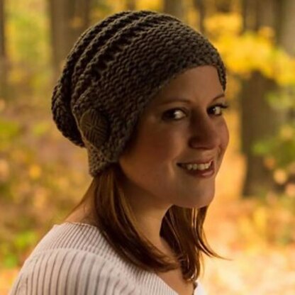 I recommend bulky or super bulky yarn (although you could use 2 strands of worsted weight yarn). Grey hat in pattern photo was made on 48 peg kk loom with bernat collegiate chunky in heather grey. The finished hat measures around 10 inches. If you would like it longer you can either increase the length of the brim or do addition repeats of the body portion of the hat.