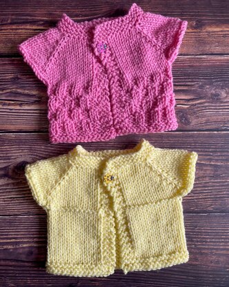 Knitting pattern for chunky, no sewing, top down, knit flat baby cardigans for newborn to approx 3 months.