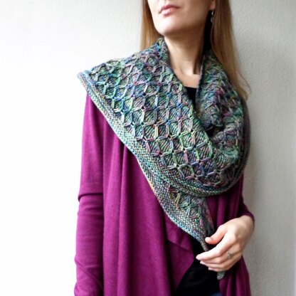The Colourist is a crescent shaped shawl that highlights the beautiful different shadings of variegated yarns while taking advantage of a classic diamond pattern with elongated slipped stitches.