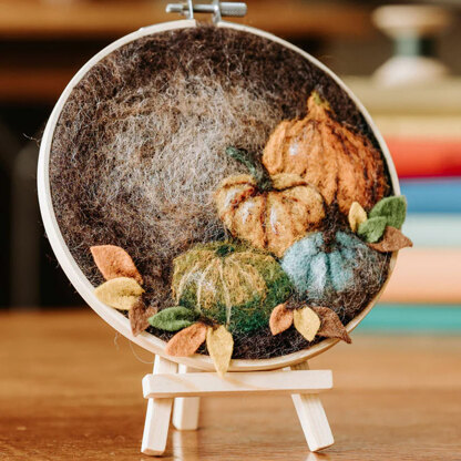 Coorie doon' and let your mind fill with thoughts of Autumn whilst you needle felt these gorgeous pumpkins in a hoop. Such atmospheric pumpkins in wonderful shades of oranges, blues and greens set against a brown background and sitting on a swirl of smoke. They're beautifully contrasted with felt fabric leaves. Create a beautiful needle felted scene with this sustainable needle felting kit with all you need to start creating! It includes clear detailed photographic instructions and the kit components are sourced in the UK where possible. A beautiful craft kit for beginners to start a new hobby! It's also a wonderful addition to collections created by those more comfortable with their needle felting skills. You can enjoy 'painting with wool' no matter your skill level.