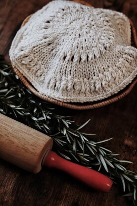 "Classic knit stitches and subtle lace create a beautiful and practical bread cover for the easy-to-knit and beautiful Dusk Bread Cover knitting pattern."