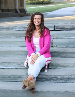 You will need: • 1 (2, 2, 2, 2) (2, 2, 2, 2) balls of Wool and The Gang Shiny Happy Cotton in Ivory (Color A) for sizes XS (S, M, L, XL) (2XL, 3XL, 4XL, 5XL) or 150 (170, 190, 210, 225) (245, 265, 280, 300) yards of a similar yarn that matches gauge • 4 (5, 6, 6, 7) (7, 8, 9, 9) balls of Wool and The Gang Shiny Happy Cotton in Hot Pink (Color B) or 600 (680, 795, 850, 955) (1070, 1180, 1315, 1375) yards of a similar yarn that matches gauge Model is wearing the cardigan with 4 inches of positive ease.