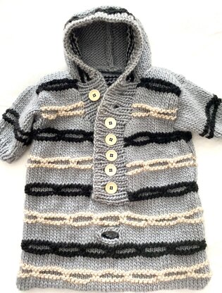 This chunky baby bunting is a great baby gift to knit. It has a nice roomy hood and a slit for the car seat strap so your little one can be nice, warm and comfy without having to be dressed and undressed with each car or stroller ride. Great for a boy or girl.