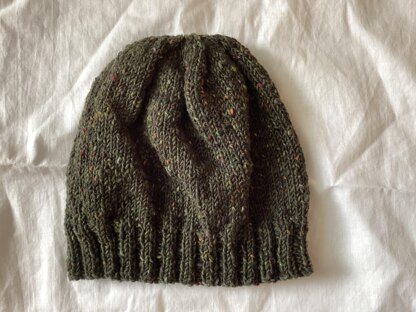 It is knitted from the bottom up using UK 4mm 16 inch circular needles and DK or Aran yarn.